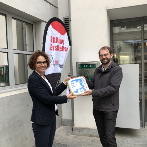 Die Stiftung Ersthelfer Nordwestschweiz übergibt Stadtpräsident Pascal Bolliger den Defibrillator. Dieser Defibrillator soll der Bevölkerung jederzeit öffentlich zur Verfügung stehen.